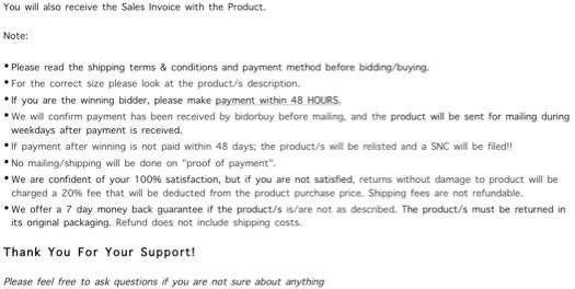 7 Days: We offer a 7 day money back guarantee if the product/s is/are not as described. The product/s must be returned in its original packaging. Refund does not include shipping costs.