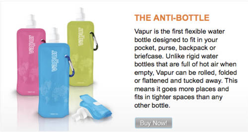 With the pull-top, drinking from this 16 oz. bottle feels like you’re using a sports bottle, since you can squeeze it, and interestingly enough, when you’re done it actually sucks air back in. This is due to the semi-ridgid, stiff sides and the fact that the water at the bottom wants to expand the container, so air rushes in before you can close the top. You can thank gravity and air pressure to this handy phenomenon that keeps the bottle upright even when there’s much less water inside. It does go floppy when the water’s almost gone, though, but at that point you can just roll it up or lay it flat and stuff it in a backpack (or purse, ladies) and, if you do roll it up, it is actually small enough to fit in a pocket, although since the opening is hard plastic you might want to put it in your back pocket. That also means that as you drink it, you are carrying around a progressively smaller container, making Vapur better than a bottled water in pretty much every respect. The very small size actually means it’s more convenient to bring with you while empty, as you can easily fill it up at work or at a drinking fountain, meaning you can simply leave it in your purse or bag.We're digging the Vapur, a refillable and flexible water bottle that can be neatly folded, rolled up or flattened when the agua's gone (or before you load it up at a water fountain). It's easy to carry around and sort of like a Murphy Bed--it's only in its bulkiest form when it's in use, and the rest of the time it pretty much disappears.