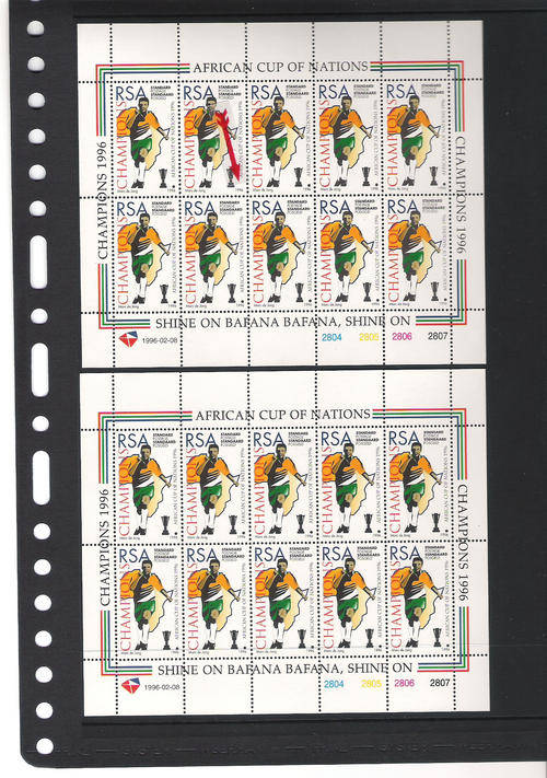 SACC 939/939a (2008 937/937a): Unmounted mint sheetlets of 10 - Soccer African Cup of Nations issued 8 February 1996. The top sheetlet is with the missing black dot above "1996" row 1 second stamp. The bottom sheetlet is the normal printing. Please contact me if any further information is required. You will receive the items shown in the image.