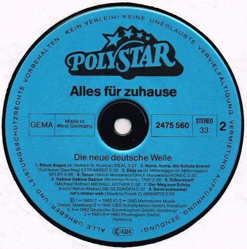1982 German POLYSTAR pressing, release number 2475 560, of compilation album by VARIOUS ARTISTS: Alles für zuhause - Die Neue Deutsche Welle. The track & other details are shown on the images, as provided. The record has a number of faint and ineffective sleeve-scratches, otherwise in a seldom played, very good plus condition. The cover has lightly scuffed corners and edges, a sticker abrasion & remnants at the front upper right, some edge & surface crinkles, plus light ring-wear, otherwise in a very good shape. VG+ / VG- |