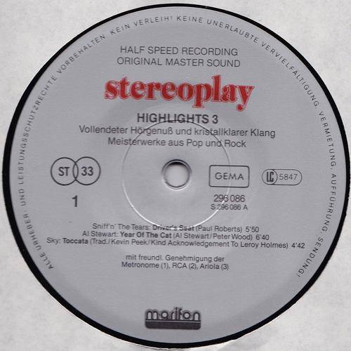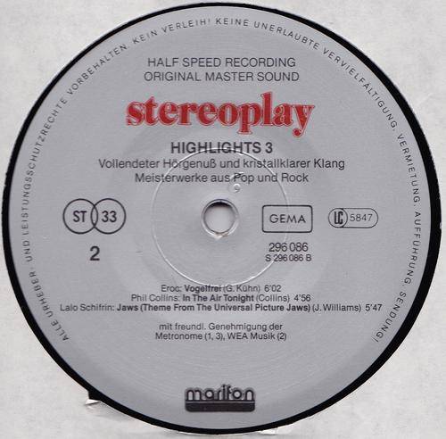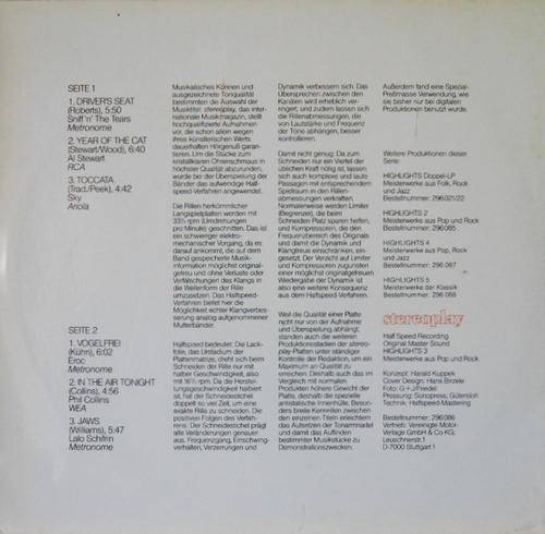 1983 German STEREOPLAY - HALF SPEED RECORDING / ORIGINAL MASTER SOUND Audiophile pressing, release number 296 086, of compilation album by VARIOUS ARTISTS: HIGHLIGHTS 3 - VOLLENDETER HÃRGENUSS - KRISTALLKLARER KLANG: MEISTERWERKE AUS POP UND ROCK. The track details are as shown on the images provided. The record is in a practically unplayed, near mint condition. The cover has very lightly bumped corners, some light edge crinkles, some very light ring-wear at front & back, plus there are a few light scratches at the back, otherwise in a very good plus shape. |