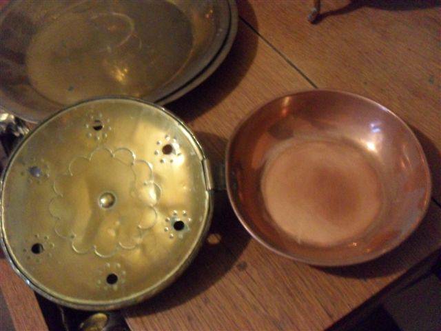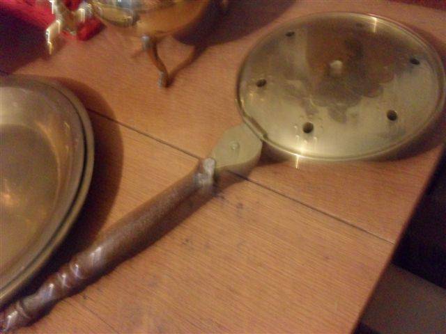 39 CM WARMING PAN ..BOTTOM IS COPPER AND TOP IS BRASS WITH WOODEN HANDLE...HANDLE IS SLIGHTLY LOOSE NEEDS A NEW SCREW.....