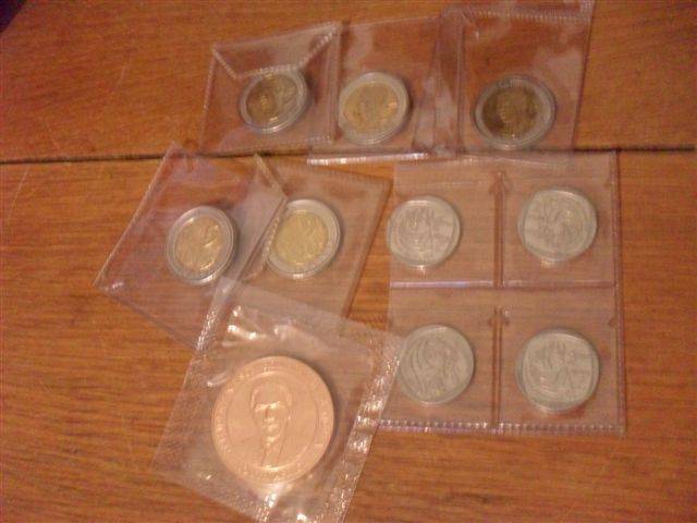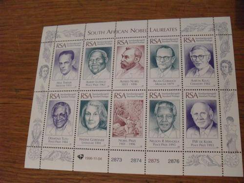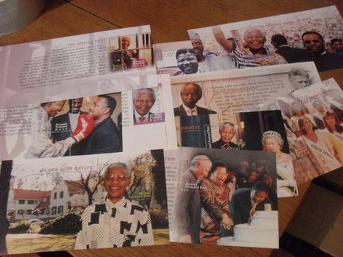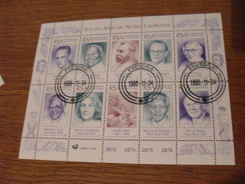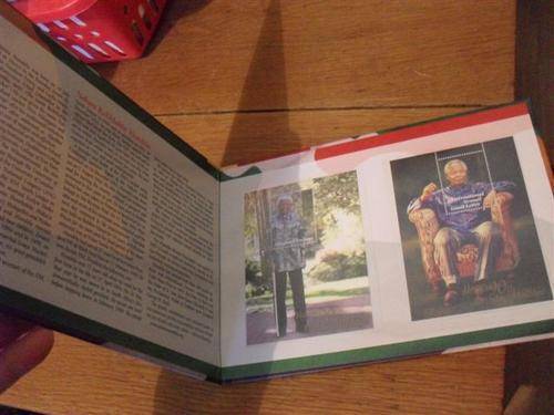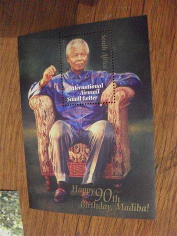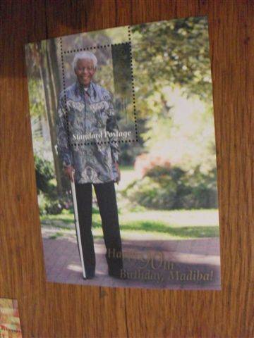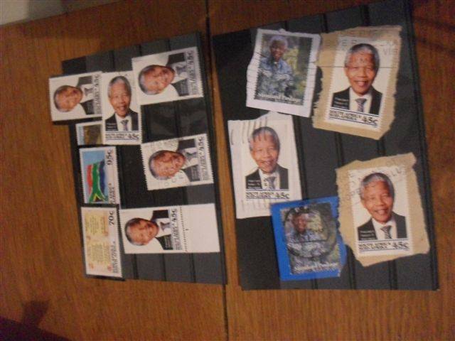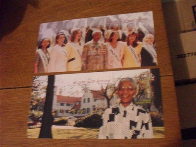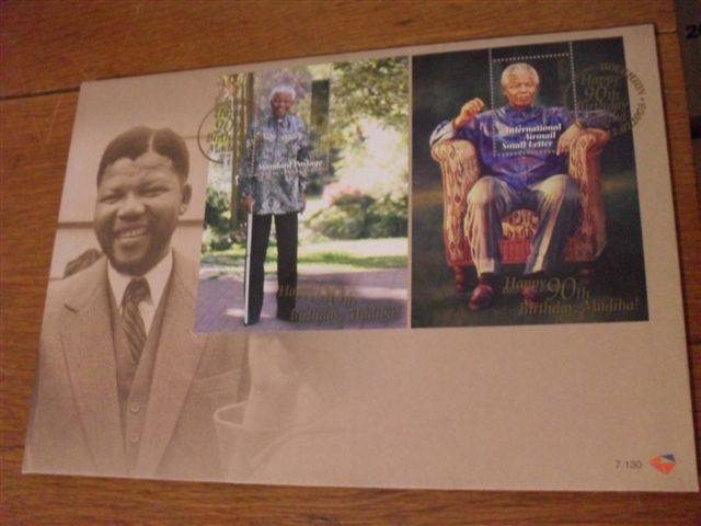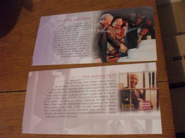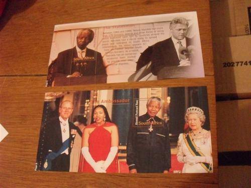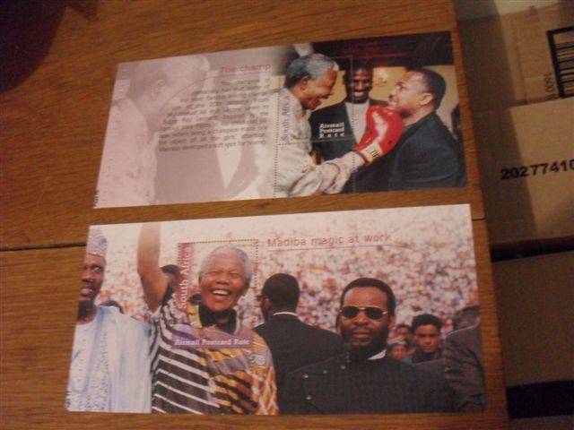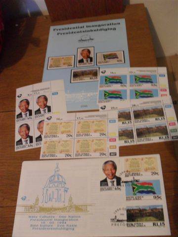 NICE LOT OF 13 MANDELA POSTAGE STAMPS MINT AND USED....POST OFFICE BULLETIN PRESIDENTIAL INAUGURATION.....FDC 6.3b.....MINT CONTROL BLOCKS OF SET OF 4 M/S SA NOBEL LAUREATES....1 X MINT AND 1 X HAND CANCELLED PRETORIA.....MINT M/S ORDER OF ST JOHNS.....1 X HAND CANCELLED M/S RWANDA.....90 TH BIRTHDAY MINT M/S 1 X ST POSTAGE AND 1 X INT POSTAGE .....FDC 90 TH BIRTHDAY HAND CANCELLED IN GOLD PRINT HOUGHTON POST OFFICE.....H/C STAMP FOLDER WITH 2 X 90 TH BIRTHDAY MINT M/S......2001 SOUVERNIR BOOKLET NO 8 WITH 10 DIFFERENT MADIBA STAMPS AND 2 POST CARDS ALL MINT....COMMEMORATIVE SOLID COPPER COIN....4 X R2 10 YEARS OF FREEDOM......3 X SMILING FACES AND 2 X 90TH BIRTHDAY R5 COINS....POSTAGE IS R58