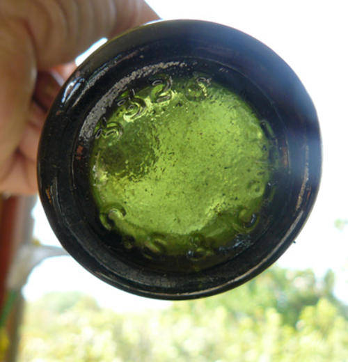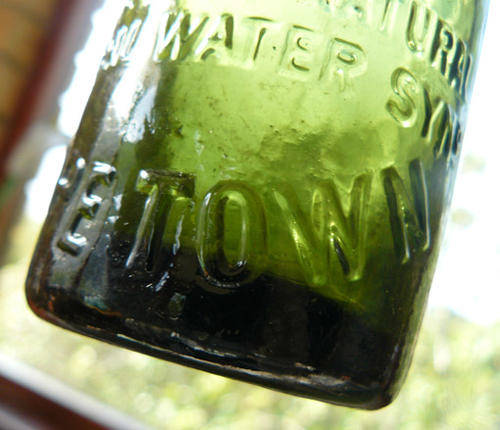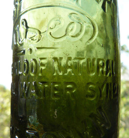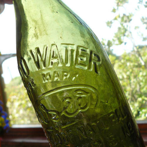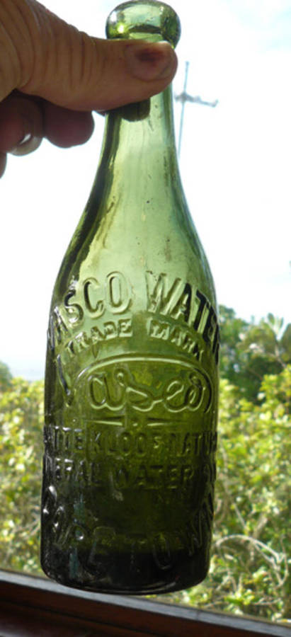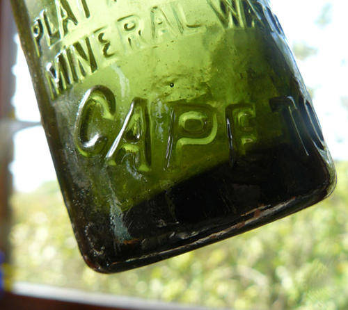 A handsome green blob top bottle, 19.5 cm high. The company was originally the "Plattekloof Natural Mineral Water Syndicate". The bottle is in very nice condition, with an air bubble in the glass. It was made by Cannington Shaw & Co.