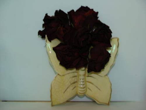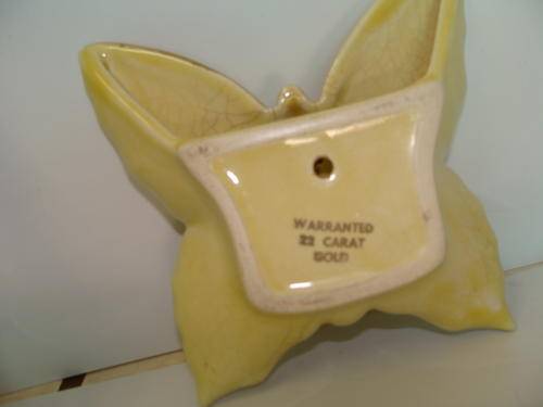 WALL POCKET VASE YELLOW BUTTERFLY- APPROXIMATE SIZE:Length 125mm Width130mm Depth 20mm-Sold as is in pictures- Other items not included-Crackle to glaze- back stamped waranted 22 carat Gold