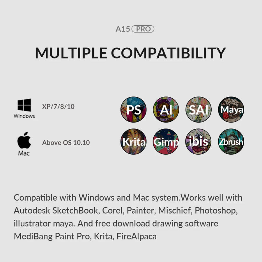 5. Compatibility: A15Pro graphic tablet must be used with a computer. Compatible with Windows. Compatible with major designer softwares , such as Photoshop, Illustrator, Sai, Corel painter, Comic studio, MediBang Paint, Paintstorm Studio ,Clip Studio, Krita ,Zbrush etc. Veikk provides one-year warranty and lifetime technical support for all our pen tablets