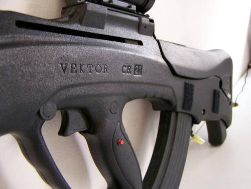 VEKTOR CR-21 FULLY AUTO AEG AIRSOFT RIFLE.This is the only one of its kind world wide.It was built for a Movie called "DOOMSDAY 2008" for training purposes.This was originally manufactured in South Africa for the SANDF and was a proto-type bull-pup concept based on the LM-4 RIFLE.It is battery operated and is rechargable.The magazine capacity is 500 6mm bb's and fire's as fast as you can pull the trigger.