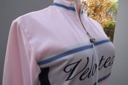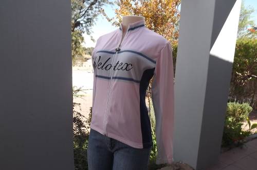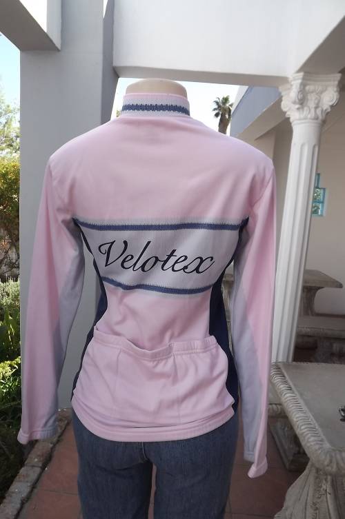 Velotex zip-up long sleeve top in pink,navy and light grey.Size 32/8.Elasticated seam.three back pockets 100% polyester.used but still in fine condition.