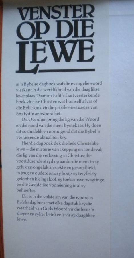 Venster op die lewe. Stofomslag is stukkend en boek het 'n geskenkinskrywing voor in maar verder goed.