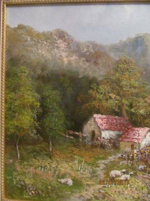 THIS SUPERB WORK BY THE ARTIST DEPICTS A LOVELY RURAL SETTING SOMEWHERE IN SOUTH AFRICA WITH A SCENIC MOUNTAIN RANGE AS A BACKDROP TO A FANTASTIC LANDSCAPE OF BRIGHT OUTDOOR COLORS. A SMALL HOMESTEAD STANDS QUIETLY NESTLED AMONG CLUSTERS OF TALL AND SHADED GREEN TREES WITH A SMALL FOOTPATH WINDING SOFTLY TOWARDS THE VIEWER.