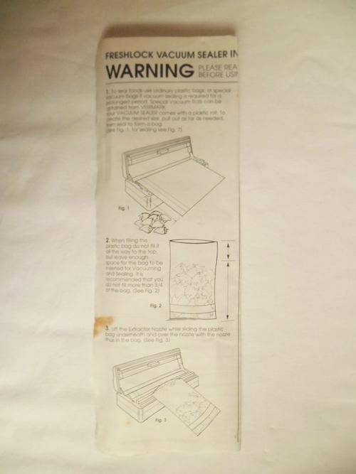 Keep the meat and vegetables etc. fresh or seal important documents etc.. Store your foods in freezer for longer periods. Remove the air, seal the bag and cut off the bag. Seals any ordinary plastic bags.12" or 300 mm double seal. Wall mountable. Instruction manual. Domestic use only.