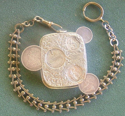 A NICE WALLET IN WORKNG CONDITION THAT TAKE 1SHILLINGS,3D,6D IN THE BACK HALF SOVEREIGN AND FULL SOVEREIGNS,,THIS IS A VERRY OLD WALLET CARRyED BY ONLY THE RICH ,ITS GOT SOME SORT OF CHAIN ON THAT WAS CLIPED ON THE JACKED NO COINS INCLUDED IN THIS DEAL