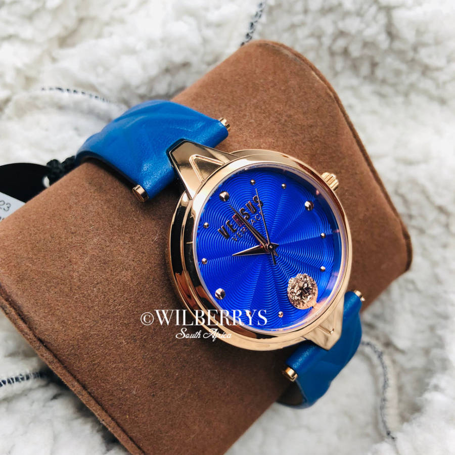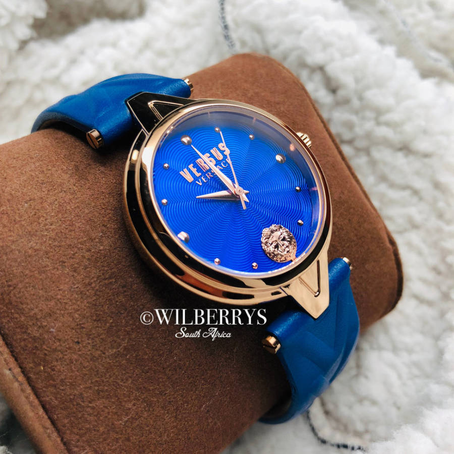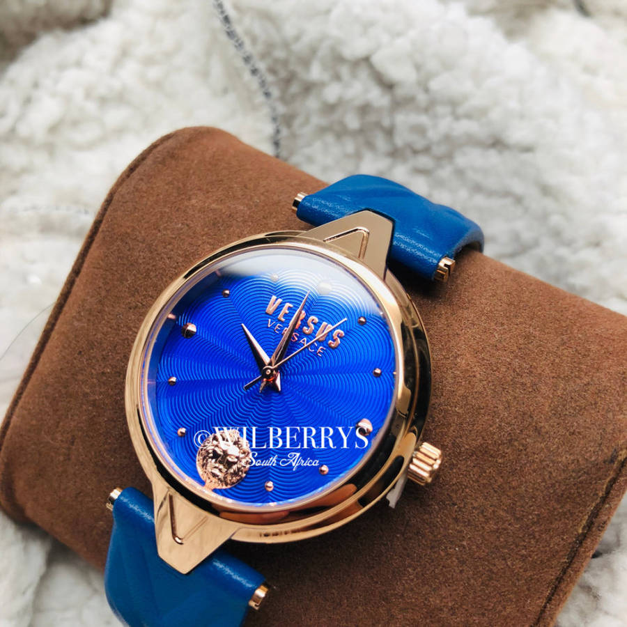 It features a blue leather strap, a gold stainless steel case and has a white dial with three hand movement and versus lion head at 6 o'clock marker dial. 34mm case width. Other features include a mineral crystal protective window, quartz movement and water resistance up to 30m/99ft (avoid water). Make a stunning statement on your wrist with this lovely watch.