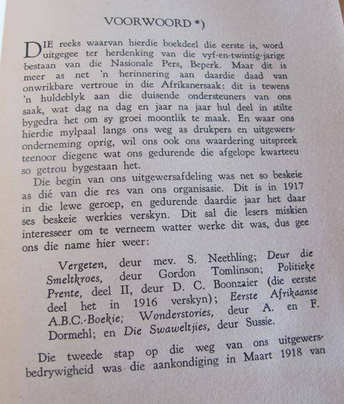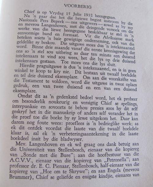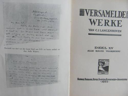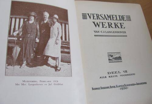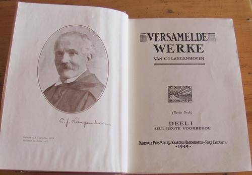 Hardeband Versamelde werke van C J Langenhoven wat strek oor die tydperk 1949 - 1955. Die boeke is oor die geheel nog mooi en slegs geel kleeflintmerke te bespeur soos ou plastiek verwyder is. Hier en daar 'n rugkant wat effense verwering toon ,wat aan die ouderdom vd boeke toegeskryf kan word. Die boeke bevat kosbare stories, gedigte en vertellings!