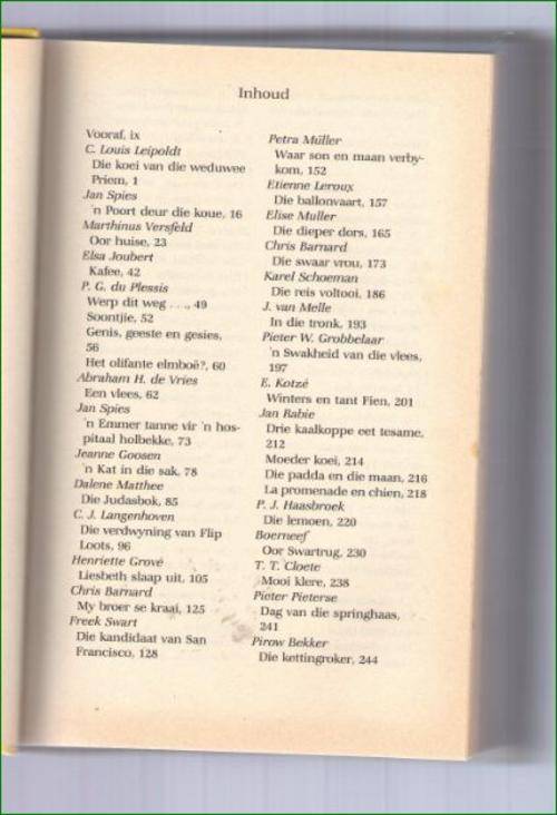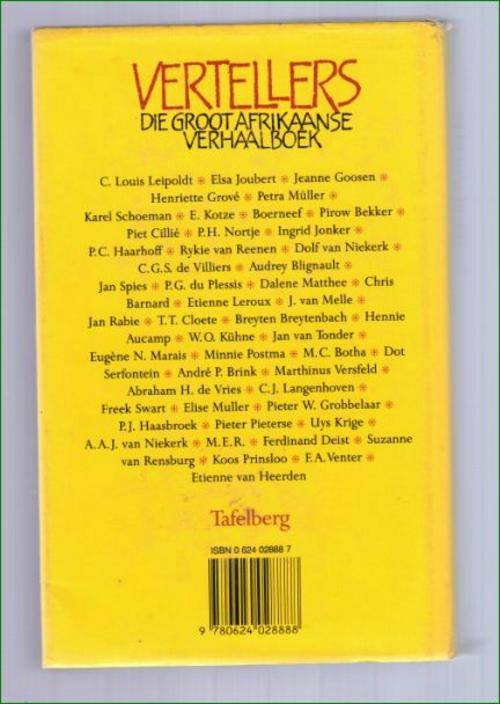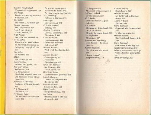 Ingrid Jonker - C Louis Leipoldt - Elsa Joubert - Jeanne Goosen - Henriette Grove - Petra Muller - Karel Schoeman - E Kotze - Boerneef - Pirow Bekker - Piet Cillie - PH Nortje - PC Haarhoff - Rykie van Reenen - Dolf van Niekerk - CGS de Villiers - Audrey Blignault - Jan Spies - PG du Plessis - Dalene Matthee - Chris Barnard - Ettienne leRoux - J van Melle - Jan Rabie - TT CLoete - Breyten Breytenbach - Hennie Aucamp - WO Kuhne - Jan van Tonder - Eugene N Marais, - Minnie Postma - MC Botha - Dot Serfontein - Andre P Brink - Marthinus Versfeld - Abraham H de Vries - CJ Langenhoven - Freek Swart - Elise Muller - Pieter W Grobbelaat - PJ Haasbroek - PIeter Pieterse - MER - Ferdinand Deist - Suzanne van Rensburg - Koos Prinsloo - FA Venter - Etienne van Heerden