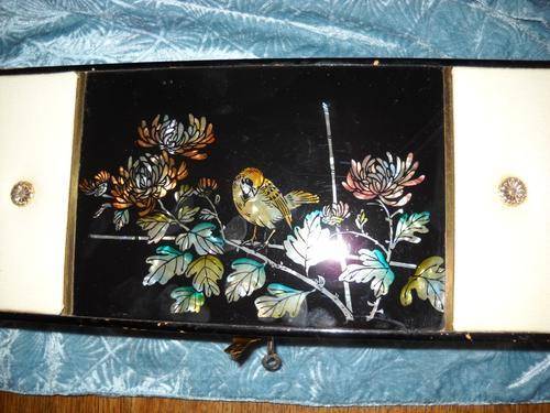 MOTHER OF PEARL FRONT, PROBABLY MADE AROUND SIXTIES,LAQUERED BOX WITH SKAY INLAYS