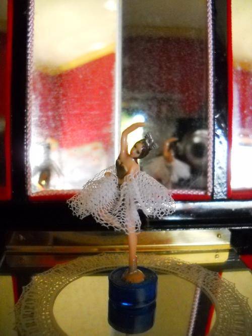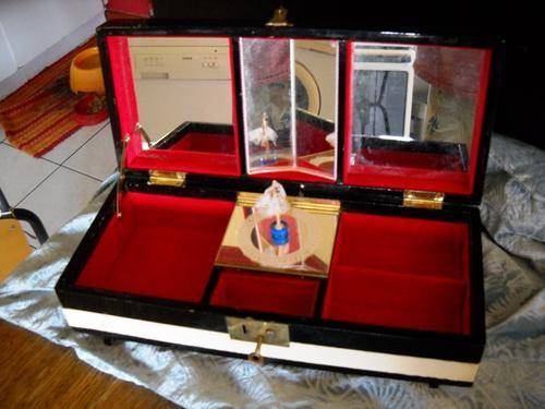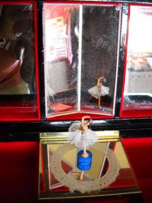 GOOD CONDITION, MUSICBOX AND BALLERINA WORK( SHE DANCES ON THE LITTLE MIRROR), SOME NICKS TO THE LAQUER,CLEAN INSIDE,MIRRORS STARTING TO GET A BIT DULL IN SOME SPOTS; ALTOGETHER A CUTE AND LARGE BOX 35X15 X9 CM(WITHOUT THE LEGS; KEY IS THERE