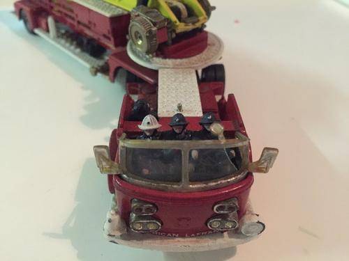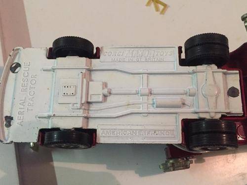 A large aerial rescue truck from the Corgi Major toys. The size is 28cm in length. The extending ladder is damaged but is there. An impressive model with many moving parts