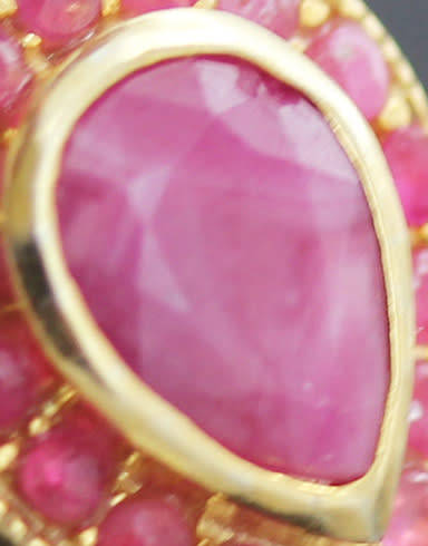 This unusually long (83cm) and splendid necklace has a striking feature link/pendant of natural pinkish rubies set in gold-hued sterling silver. The link/pendant features two matching pear-shaped horizontal gold-hued sterling silver elements that consist of a larger pear faceted ruby bezel set in the centre, bordered by 16 x round cut rubies claw set in a channel that has a textured nubbed border on the outside. The natural rubies are bright, pinkish and alive with interesting natural inclusions. The pearls are large, creamy and natural; lustrous against the bright pink and warm gold. The piece weighs a heavy 64.47 grams and bears the 925 hallmark indicating sterling silver. You can wear the ruby feature anywhere but I rather like setting it on one side on the collar bone or a little lower. Its nice to find a real pearl necklace this long! It is a truly elegant statement piece of jewellery with a clever design twist that makes it special.