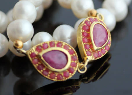 VERY LONG PEARL NECKLACE WITH FEATURE LINK OF RUBIES SET IN GOLD-HUED STERLING SILVER