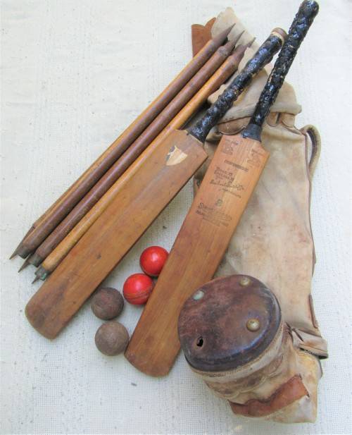 I am not an expert in vintage cricket items, but acquired this old set, still in what appears to be the original carry bag. Set consists of 2 wooden cricket bats with impressed wording. these are intact, appear to have been well used over time. full set of wood and metal wickets, but sadly no stumps (easy enough to sort). 4 cricket balls, 2 with red are perhaps more modern. wickets measure approximately 77 cm long. Bats about 80 cm long. Balls standard 6.5 cm diameter. Offered at R1 no reserve. General condition good, not sure if bat handles had grips originally? Sold as is!