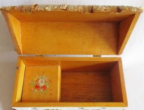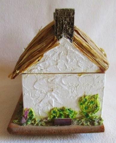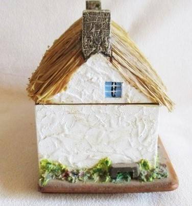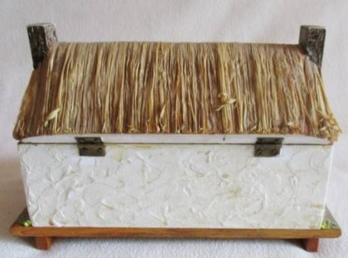 A VERY UNIQUE JEWELLERY BOX FROM THE ISLE OF MAN AND DEFINITELY VERY OLD - EVEN PATINA ON THE SCREWS! SO UNUSUAL - A WOODEN BOX WITH ISLE OF MAN COTTAGE DESIGN AND WITH A 'ROOF' MADE FROM REAL GRASS/STRAW - SWISS MUSICAL MOVEMENT - 18CM X 9CM X 12.5CM AND IN VERY GOOD CONDITION PLAYING THE BEAUTIFUL MEDIEVAL SONG 'MY LADY GREENSLEEVES' REFER IMAGES