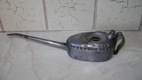 This very old can measures 12 cm from tip of spout to back of handle, height of can part is 5 cm and it is 6.5 cm over widest part of body