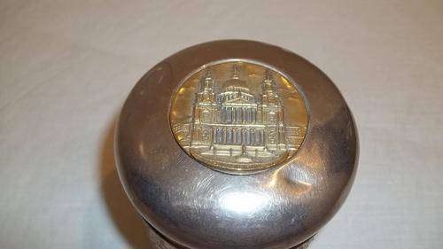 THIS VERY PRETTY ANTIQUE GLASS TRINKET BOWL WITH IT'S METAL LID HAS A BRASS MEDALLION OF ST. PAUL'S CATHEDRAL ON IT. THE TRINKET BOWL MEASURES 8cm TALL AND IS 7.5cm WIDE. THE BOWL AND LID HAVE SEEN SOME WEAR AND TEAR AND THERE ARE NO CRACKS IN THE GLASS, BUT THE WEAR AND TEAR IS TO BE EXPECTED FROM AN ANTIQUE PIECE. THIS REALLY IS SOMETHING QUITE SPECIAL.