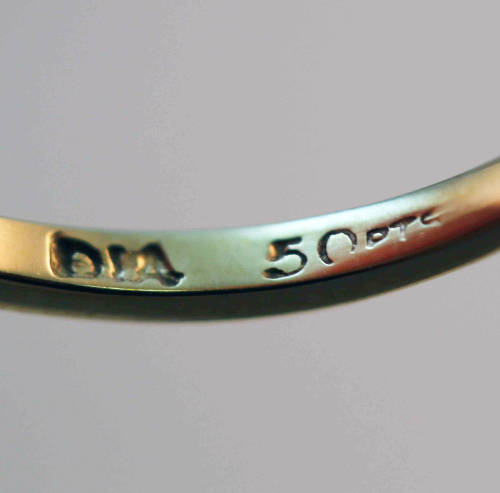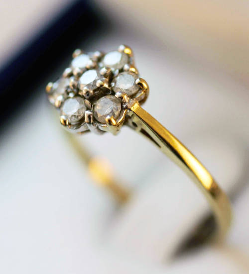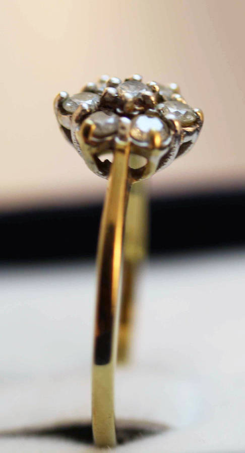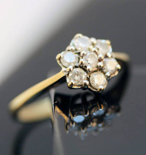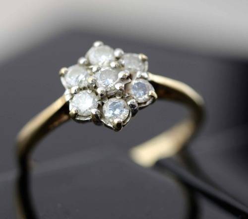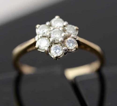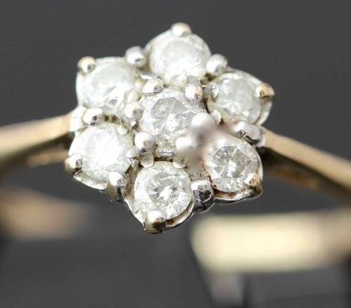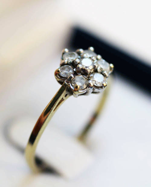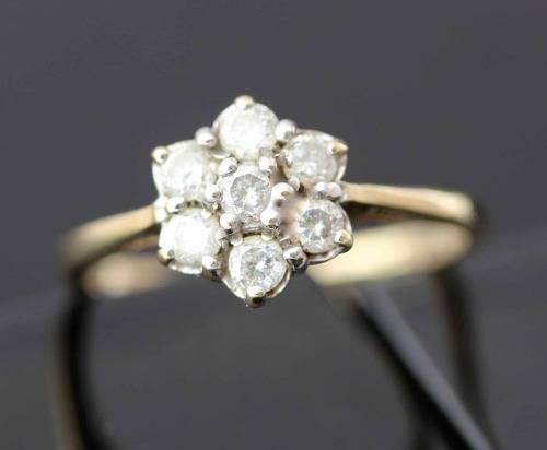 This pretty vintage English piece has a distinct 'daisy' design on the ring head. Seven round brilliant cut diamonds, one in the centre and six 'petals' circling it. The diamonds are excellent - half a carat in total, their clarity is VS/S1, the colour I/J; claw set in 9ct white gold, the shank is slim, a contrasting 9ct yellow gold. The pedigree of the ring is evident in the '375' indicating 9ct gold, the London assay mark and the jeweller's signature. I have had the ring jeweller tested and authenticated and his evaluation certificate for R16'573 will accompany the ring. Feminine on the hand, it would make a beautiful engagement ring or a really pretty investment piece to enjoy.