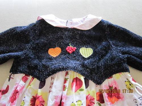 Very pretty dress from French Designer Babymini par Catinini.Purchased in UK.The dress is fully lined and has lots of detail on which I have showed in the photos.The top part of the dress is in a navy blue with pink speckle on its sort of like a furry material but not thick.In very good condition.Dress say 12 months but as french designer come up small would say 9-12 months.Beautiful and unusual dress