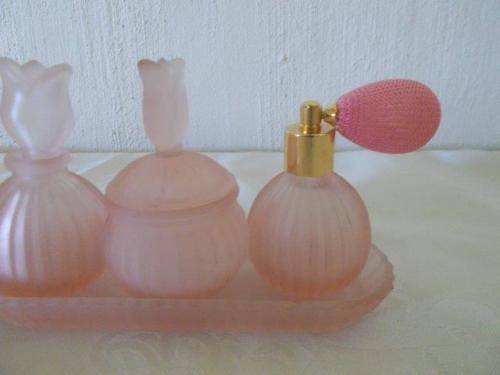 pretty pink glass dressing table set on glass tray item in good used condition