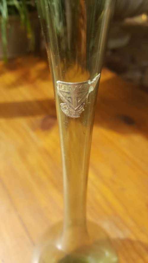 A very rare GULLASKUF SMOKEY GREEN GLASS VASE WITH ELONGATED NECK. Made by Gullaskuf of Sweden. Have the remnants of the original Gullaskuf factory Logo with is almost always lost to have this IDENTIFIER MARK is a rarity in itself. There were 4 designers working at the factory during 1927 and 1983 but this elongated neck design looks like a ARTHUR PERCY DESIGN as seen from examples seen online. YOU WILL BE SURPRISED TO SEE FOR YOURSELF ONLINE WHAT THESE GULLUSKRUF VASES SELL FOR. Size: Large 31cm High 9,5cmDiameter Bulb below and 3cm Diameter neck top Condition: Good vintage condition, no chips or cracks, just some minor internal staining from use. ALSO SEE MY OTHER ITEMS LISTED. NOTE THIS ITEM IS TOO FRAGILE AND DELICATE TO BE SHIPPED WITH OTHER ITEMS. BUT THERE IS THE OPTION OF PICKUP AT MY HOME.