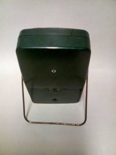 Size..9cm by 14cm.Fine hair line crack near controls as seen in pics.General all round condition... Good.Item in working order. Make..Grundig.Made in Germany. Green and cream/white hard plastic and front silver metal grid.Has metal stand.This item is super cool.It will truely amuse you.Battery operated. Battery not included.