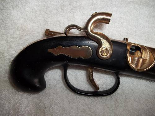 THE PISTOL IS VERY WELL AND HEAVY MADE AND COMES WITH ITS OWN WOODEN STAND. THE PISTOL IS MADE OF METAL AND I AM ALMOST SURE THAT IT IS A TABLE LIGHTER ....... PLEASE SEE PHOTOS