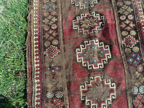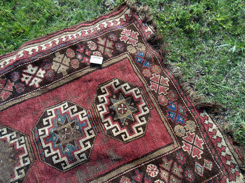 LOVELY VERY OLD AND WELL WORN PERSIAN RUNNER TYPE RUG, A LITTLE THREAD BARE IN PLACES, AND EDGES WORN, BUT NO HOLES SEEN. STILL PRESENTABLE, COLOURFUL AND FULL OF CHARM. NICE AS AN ENTRANCE HALL RUG IN A COTTAGE. PLEASE NOTE SOLD AS IS, DON'T SUGGEST REPAIRS, BUT COULD DO WITH A CLEAN. MEASURES APPROX 1,2 X 1,9 M. SEE MATCHBOX ON THE RUG FOR SIZE COMPARISON