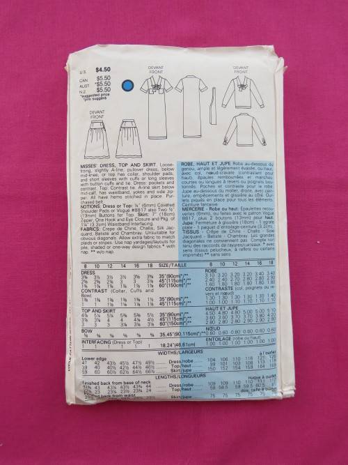 'VERY VOGUE' sewing pattern 9190 in sizes 8,10 and 12 for skirt,top and dress.