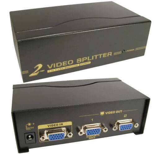 This video splitter are designed for desktop PC or laptop/ notebook PC use, supplied in a durable, compact metal housing. The splitter duplicates and boosts the input signal to 2 x SVGA or Multi-sync Monitors, with a signal rate of 250 Mhz. Video Splitters are ideal for applications such as tradeshows, business meetings and demonstrations.