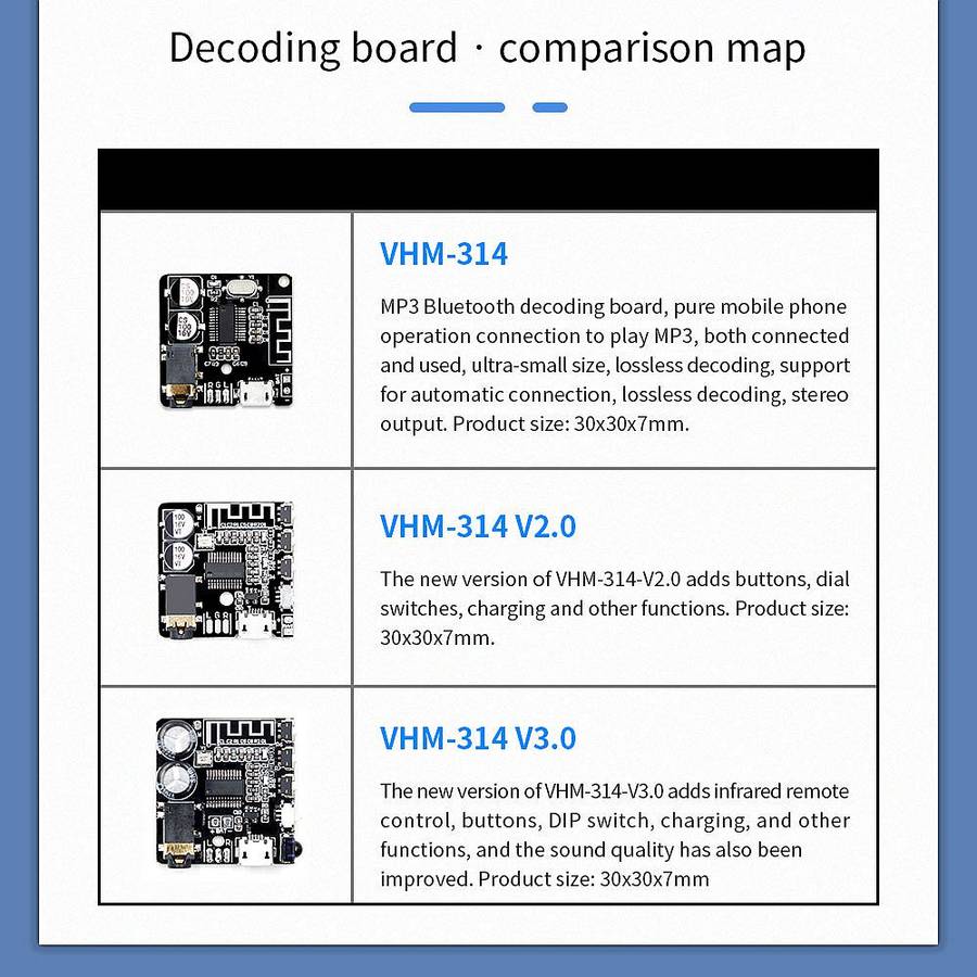 | Product | VHM-314 Bluetooth Audio Receiver Board Bluetooth 5.0 MP3 Lossless Decoder Board Wireless Stereo Music Module |