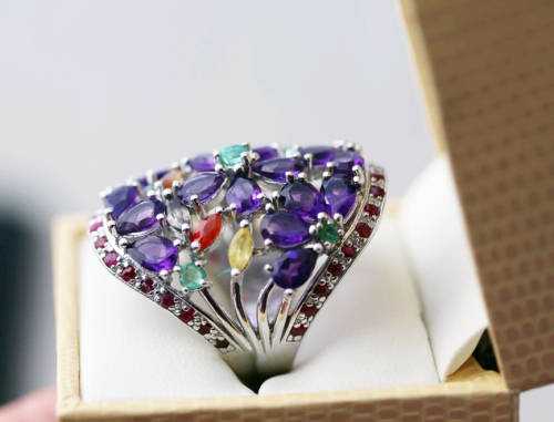 Big, showy and beautiful! This handcrafted piece, creatively designed and executed, is a floral bouquet on the hand. The structure of the ring is created in '975' hallmarked sterling silver which provides a gleaming base for a floral design with a multitude of claw set natural gemstones. A central flower is surrounded by petals and an organic leaf design, framed by 18 Brazillian-mined dark pink rubies, top and bottom. 17 Uruguayan mined pear-cut amethysts (totalling 3,7 carats) form petals and leaves; the very intense purple offsetting the varied greens of 8 round-cut Brazillian emeralds (0,28 carats). 7 Africa Songea-mined marquise-cut sapphires in various colours complete the bouquet. All the gemstones have been jeweller tested and authenticated. Heavy at 14,48 grams and large, the ring runs 34mm up the finger. It lies nice and snug on the finger. This, along with the openwork design, makes it an elegant, not chunky piece. Vibrant and dramatic on the finger!