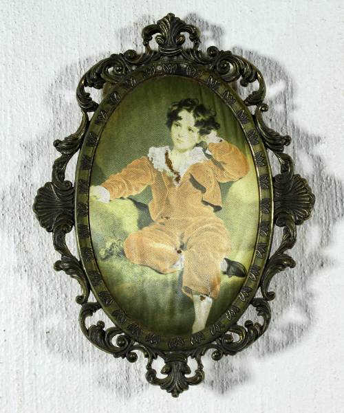 A beautiful print on fabric depicting a Victorian boy framed in an ornate metal frame. The frame measures 20cm x 14.5cm. Bid now!