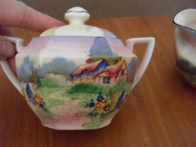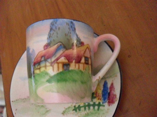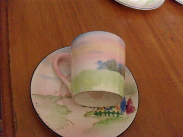 BEAUTIFUL VICTORIAN COFFEE/DEMITASSE SET WITH COUNTRY DESIGNS IN LOVELY PASTEL SHADES.....SEE THE PICS..........(MARKINGS IS TUDOR AND A PICTURE OF A SAILING SHIP )