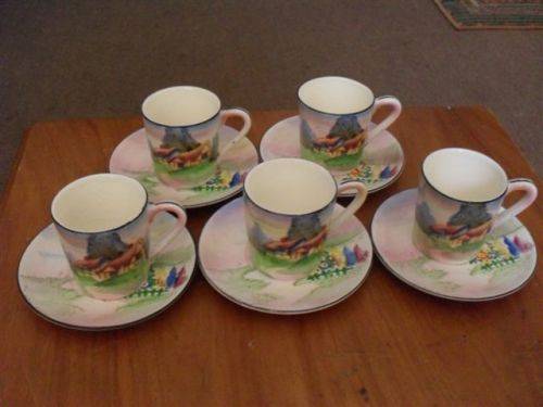 5 CUPS AND 5 SAUCERS...PLEASE NOTE THERE IS SOME GRAZING TO GLAZE COMMON IN OLD CERAMICS....