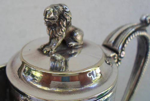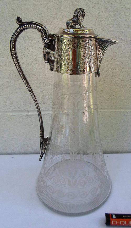 Value R1800. A truly magnificent Antique, Victorian era Claret jug. Hard to find in this amazingly good condition, ideal for Sherry. No makers name seen, but of exceptional high quality. Chased pattern to lid, lion finial, desirable ram's head handle support. Hand etched pattern to glass section. No glass disease or marks, no chips, cracks to glass. Item almost perfect, no repairs. Slight rub to plate lid rim, no other wear.