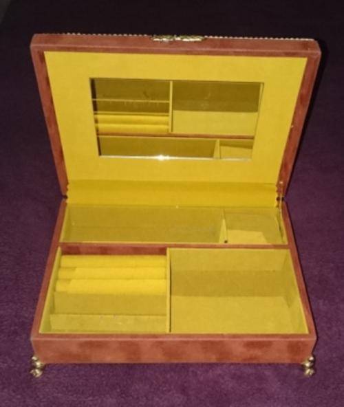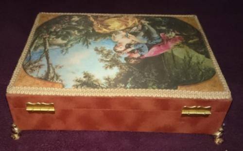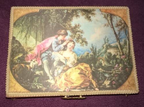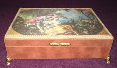 Stunning Vintage Jewelry Box with stunning Victorian Silkscreen picture and Stunning gold Cabriole Legs. Dimensions are 28cm x 20cm x 9cm high. In good condition!
