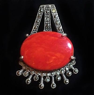 HANDMADE VICTORIAN NATURAL RED CORAL AND MARCASITE PENDANT