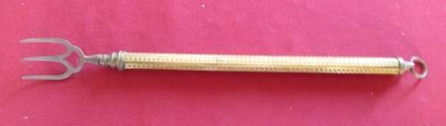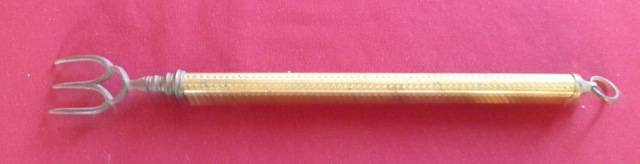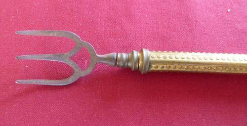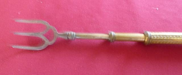 An unusual Victorian brass three-drawer telescopic toasting fork in good condition with ring handle. The prongs are iron. Measures 63cm open and 32cm closed.