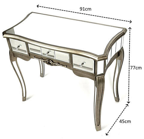 The Victorian Mirrored Dressing Table using a wooden frame painted with a silver finish. This glass mirror dresser set has one large storage drawer and two smaller faux drawers either side which each have a lovely crystal effect handle. Bella mirrored vanity set includes a Console Table, only.
