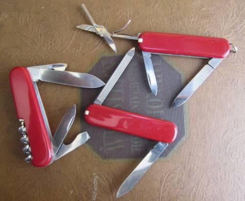A Job Lot of Victorinox knives consisting of 1x Vintage 84mm Sportsman 1x 74mm Escort (discontinued) and 1x 74mm Ambassador all in good condition.