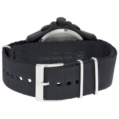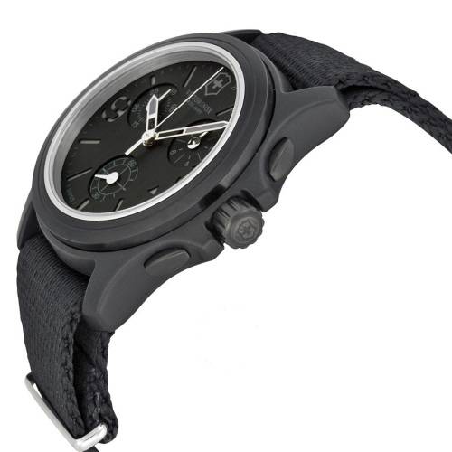 Black nylon case with a black nylon bracelet. Fixed black aluminium bezel. Black dial with index hour markers. Arabic numeral marks the 3 and 9 o'clock positions. minute markers around the outer rim. Dial Type: Analog. Luminescent hands and markers. Date display at the 4 o'clock position. Chronograph - sub-dials displaying: three - 60 second, 30 minute and 1/10th of a second. Quartz movement. Scratch resistant mineral crystal. Pull / push crown. Solid case back. Case diameter: 40 mm. Round case shape. Band width: 20 mm. Tang clasp. Water resistant at 100 meters / 330 feet. Functions: chronograph, date, hour, minute, second. Casual watch style. Watch label: Swiss Made. Victorinox Swiss Army Original Chronograph Black Nylon Mens Watch 241534.