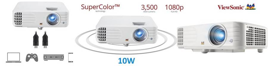 The ViewSonic PX701HD is a high brightness 3,500 ANSI lumens projector featuring a Full HD 1080p resolution that offers impressive visual performance in a brightly lit living room or meeting room. The projector adopts the latest lamp design to extend lamp life of up to 20,000 hours under SuperEco+ mode, effectively reducing lamp replacement and maintenance costs. A digital lens shift allows users to make adjustments by remote control, it's also compatible with the vColorTuner function for color profile exchange and adjustments. The dual HDMI inputs and USB power supply allow users to connect to a multitude of multimedia devices for gaming, movies, or a wireless dongle for wireless presentation.